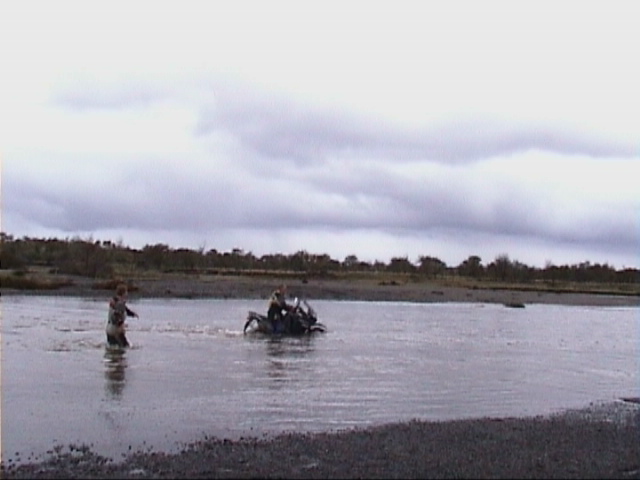 Wasser bis zum Sitz (Der Luftfilter zum Glueck auf der der Stroemung abewandten Seite). Die Stroemung war so stark, dass die Honda stromabwaerts getrieben wurde. Schliesslich nahe dem rettenden Ufer lief sie auch unter Wasser weiter, als ich sie dort kurz ablegte. Aber damit nicht genug. Das Wetter wurde weiter schlechter, soweit das ueberhaupt noch moeglich war, kaelter als 5 Grad und langsam dunkel. Keine Chance, bei unserer Reisegeschwindigkeit von ca 15 km/h die naechste Groessere Stadt , Rio Grande, zu erreichen, um uns wieder aufzutauen. Bei einer Estancia, die dort zwischen 20 und 40 km auseinanderliegen, machten wir halt, um dort einen trockenen Unterschlupf fuer die Nacht zu finden. Wir wurden in der Familie des Patrons wie Gaeste aufgenommen, sassen ploetzlich vor einem waermenden Kaminfeuer, anschliessend an einem gedeckten Tisch, mit Bestecken, Servietten, koestlichem Essen und argentinischem Rotwein. Ohne diesen unerwarteten, unglaublichen Gluecksfall waere es bei Temperaturen um 0 Grad zu einer verdammt harten Nacht geworden. Nach einem Tag Estancia-Besichtigung