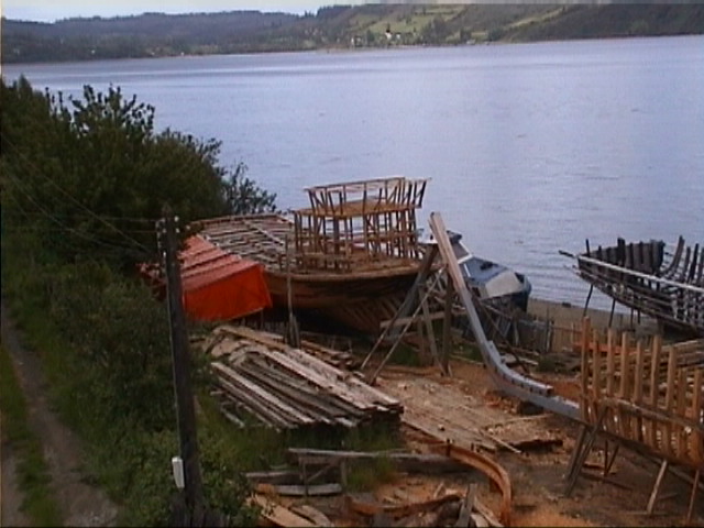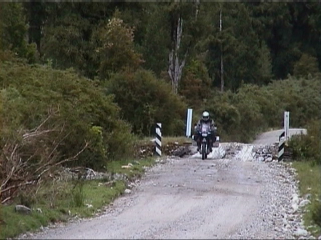 Wenn die Regenwolken den Blick freigeben, steigen aus dem undurchdringlichen Regenwalddickicht die Berge steil auf. Alle schneebedeckt, viele von Gletschern ueberzogen. Immer wieder ueberqueren wir kleine, groessere, reissende Gebirgsbaeche, Fluesse, Stroeme. Die Bruecken darueber sind ein eigenes Kapitel. Jede Bruecke ein Abenteuer. Meistens Holzbohlen, zwei Streifen, eine einfache Lage Holz in der Mitte. Mit meinem Enduro-Abitur keine Schwierigkeit. Wenn einem eine aufgebogene Bohle wie ein Spiess entgegensteht, nimmt man besser die andere Spur. Erhoehte Aufmerksamkeit ist angesagt, wenn die Bohlen nassgeregnet sind. Ich habe mir angewoehnt, dann die Luft anzuhalten. Das scheint gut zu funktionieren. Selbst auf einer schmalen, holzbelegten, nassgeregneten, im stuermischen Wind schwankenden Haengebruecke. Von Chaiten aus setzten wir auf die (annaehernd Mallorca-grosse)Insel Chiloe ueber, die wegen ihrer Eigenart immer wieder hervorgehoben wird. Heute kann ich das gut verstehen. Sie hat einen ganz eigenen, eine liebenswerten Charakter. Eine saftig gruene Huegellandschaft, in die sich die Meeresarme des Pazifischen Ozeans hineinziehen. Wenn man Glueck hat, so wie wir, gucken ein paar Seeloewen aus dem Wasser und sehen uns dabei zu, wie wir auf der Kaimauer sitzen und Kuchen essen. Alles ist aus Holz, die Schiffe,