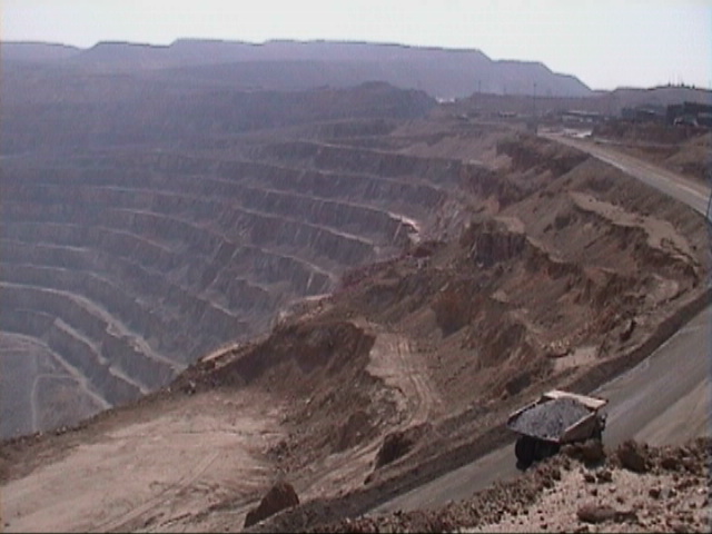 Achtung. Hier geht es auf Deutsch weiter. Vielen Dank fuer die Geduld. Mein letzter Beicht endete damit, dass ich mit dem Mut der Verzweifelung das Moto auseinandergeschraubt hatte, auf dem Werkshof der Hydraulica Calama S.A.. Der Rest ist schnell erzaehlt. Die benoetigten Kupplungsscheiben wurden abgezeichnet und als Fax zu Moto Tonino nach La Serena geschickt. Der Zeichnung entsprechend schienen Kupplungsscheiben fuer eine Honda XT 250 von 1995 zu passen, die vorraetig waren. 2 Tage spaeter waren sie da, wurden eingebaut und die ganze Kiste wieder zusammengeschraubt. Dass am Ende keine Schraube uebrigblieb, war ein gutes Zeichen. Inzwischen hat die Kupplung schon wieder knapp 2000 km - zum Teil schwierigste Strecke - hinter sich. Ich bedanke mich an dieser Stelle ausdruecklich bei Vitorio Pelemonte, dem Direktor der Hydraulica Calama S.A., der - ohne einen Moment zu zoegern - mir sofort geholfen hat. Und ohne dessen Unterstuetzung ich es sicherlich nicht geschafft haette. Unser Deal waehrend der Zeit unserer Zusammebnarbeit war, er lernt von mir deutsche Flueche - immer wenn Schrauben oder Finger klemmten bzw. geklemmt wurden - und ich bekomme von ihm ein Diplom als Kupplungsmechaniker. Waehrend der Wartezeit in Calama habe ich die groesste Kupfermine der Welt, Chuquicamata, besucht. Ein inzwischen 3 km breites, 3 km langes und 800 Meter tiefes Loch, in dem kupferhaltiges Gestein abgebaut wird.