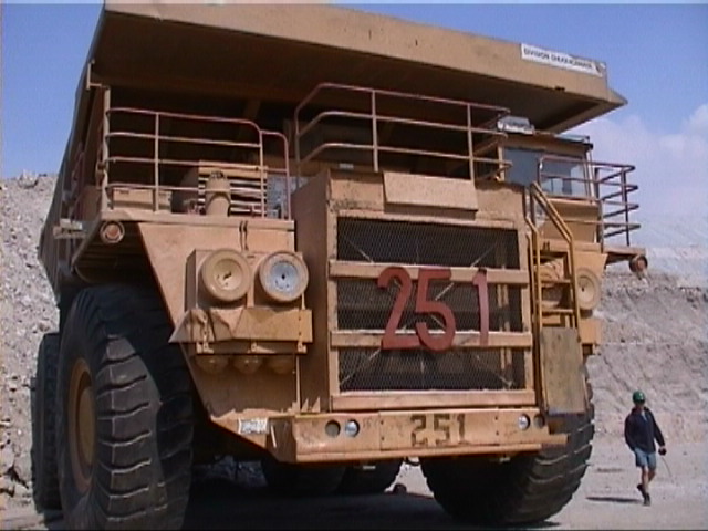 1 Tonne Gestein enthaelt 10 kg Kupfer. Die Jahresproduktion in Chuquicamata betraegt 600 000 Tonnen Kupfer. Wer ueber die 4 Grundrechenarten verfuegt, kann schoene Zahlenspiele anstellen. Wer in der Schule nur noch Taschenrechnen gelernt hat, kann es meinetwegen auch damit versuchen. Zum Beispiel: Wieviel Gestein muss abgebaut werden, um die Jahresmenge Kupfer zu erreichen? Oder, wieviel Abraum muss jaehrlich zur Seite geschafft werden, wenn das Kupfer draussen ist? Was bedeutet das taeglich bei 365 Arbeitstagen im Jahr bzw. stuendlich bei einer Arbeitszeit rund um die Uhr? Den Transport uebernehmen Speziallaster mit 3.80 m hohen Reifen, die pro Minute 2 Liter Diesel verbrauchen und 24 Stunden im Einsatz sind.