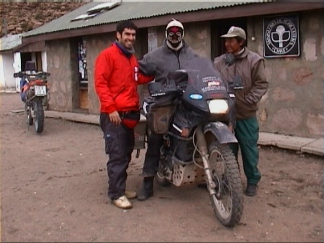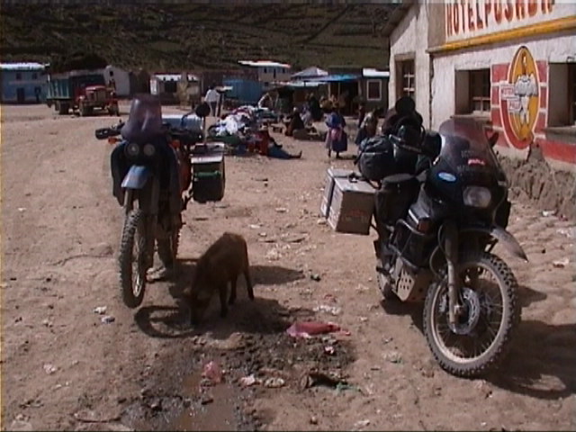 Auf der Strecke Cochabamba - La Paz waere uns 36 Stunden nach unserr Durchfahrt ein halber Berg auf den Kopf gefallen. So sind wir nur durch Schneematsch gefahren. Aber alles der Reihe nach. Erst einmal kommt wieder die spanische Zusammenfassung. Resumen despues de 4 meses de viaje y 17 000 kilometros recorridos de La Paz/Bolivia El triunfo del barro sobre el embrague - la aventura mas importante del ultimo resumen - no era largo. Despues dos dias los repuestos necesitados llegaron de La Serena y dos horas mas tarde la moto era reparado. Gracias a Vitorio Pelemonte, el gerente de la Hydraulica Calama S.A., qui organizo los repuestos y qui reparo el embrague, puse seguir en mi viaje despues algunos dias. Gracias tambien a Tonino Moto en La Serena por los repuestos inmediatamente enviados. Desde la reparacion de la moto hastya hoy he hecho mas que 2000 kilometros en parte en carreteras muy malas. El embrague trabaja correctamente. Claro, cuando veo barro de lejos, me paro y llevo a cuestas mi moto los proximos kilometros. Una vez era bastante. Desde Calama me fue a Tocopilla a la costa pacifica.. Despues pasando por Iquique y Arica a la frontera boliviana. Antes de llegar a La Paz he visitado Oruro, Potosi, Sucre y Cochabama. El invierno boliviano en este aņo esta muy fuerte.En todo el pais hay inondaciones causados par temporales con mucha lluvia. Las destrucciones estan grandes. Hay numerosos fallecidos. Bien que las condiciones rutieras estan a menudo lamentables, afortunadamente las inundaciones peligrosas siempre llegaron despues de nuestras salidas. Arica era completamente aislada 10 dias despues de mi salida. La carretera (de tierra) de Sucre a Cochabamba era suspendida dos dias despues de nuestra pasada, y la carretera de Cochabamba a La Paz tambien, solamente 36 horas despues que fuimos alla. Que me ocupa lo mas en Bolivia esta el problema de la pobreza de la mitad de la sociedad. Una pobreza que en Chile o en Argentina no se encuentra. No me parece una causualidad, que esta mitad de la sociedad boliviana esta representade par la gente indigena. La liberacion de los espaņoles y la fundacion de los estados latinamericanos tiene hasta hoy una importancia muy grande en la consciencia politica.. Me pregunto si eso esta lo mismo para la gente indigena y me dudo. Tengo la impresion, que para ellos solamente los nombres y las caras de los autoridades se han cambiado. Y nada mas. No veo visiones politicos, planes realistas, como los diferentes sociedades, hispano-criolla, mestiza y indigena, pueden vivir conjuntos en un equilibrio cultural, economico y politico. Todos con posibilidades iguales del desarollo personal. A mi opinion - la humanidad a parte - que imprudencia solamente de punto de vista economica. Las enormes diferencias entre una vida buena y la pobreza estan una forma de violencia que debe provocar formas de contraviolencia que finalmente cuestan demasiado, seran inpagables, sobre todo para paises en desarollo. Tengo miedo que las formas de contraviolencia de hoy, el narcotrafico y la criminalidad no estan el fin, pero el principio de que va suceder en el futuro. Bueno no puedo cambiar al mundo. Pero pensar de estos problemas me ayuda de comprender mejor que veo y de me sentir mejor durante este viaje. Desde La Paz iremos pasando al Lago Titicaca a Ayacucho/Peru, donde esperamos a Gaby qui va volver de Alemania para acompaņar nos en nuestra viaje hasta Alaska.