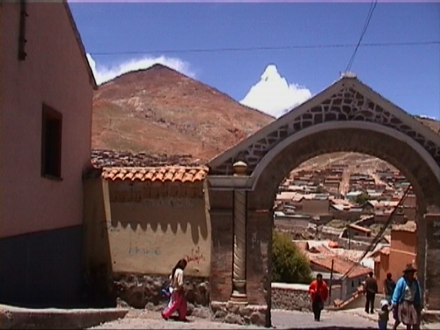 Am Ende dieser Strecke, zurueck auf Asfalt fuer die letzten 20 Kilometer, eierte meine Kiste so, als ob Rahmenbruch und platter Hinterreifen zusammengekommen waeren. War aber nicht, nur ein Dutzend Speichen war hinueber. Vielleicht waren die 40 km/h stellenweise doch zu schnell. Und jezt kommt Potosi, in 4000 m Hoehe neben Lhasa/Tibet die hoechste Grossstadt der Welt. Heute eine Stadt mit ca 120 000 Einwohnern, nach meinem Eindruck in der Mehrzahl Indios. Ueber diese Stadt, die im Mittelalter eine der groessten und reichsten Staedte der Welt war, koennte ich ein eigenes Buch schreiben. Der Reichtum Europas mit seinen Kirchen und kunstschaetzen ist wesentlich von dieser Stadt und ihrem Silberberg, dem Cerro Rico, 4800 m, mit finanziert worden.