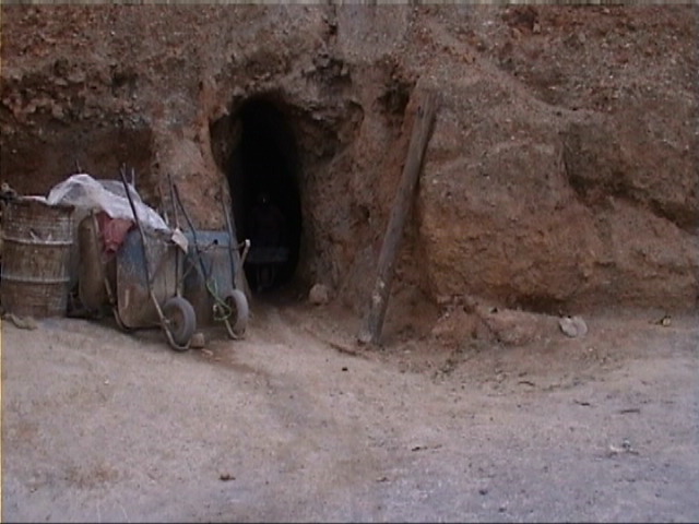 Die ca 300 noch aktiven Stolleneingaenge sehen meistens so aus, gerade gross genug, dass eine Schubkarre mit Gestein ( 100 bis 120 kg) rausgefahren, bzw. Saecke mit Gestein (50 kg) rausgetragen werden koennen. Vor dem Eingang hat jeder Minero seinen eigenenSteinhaufen, den er an Abnehmer zur Weiterverarbeitung verkauft.
