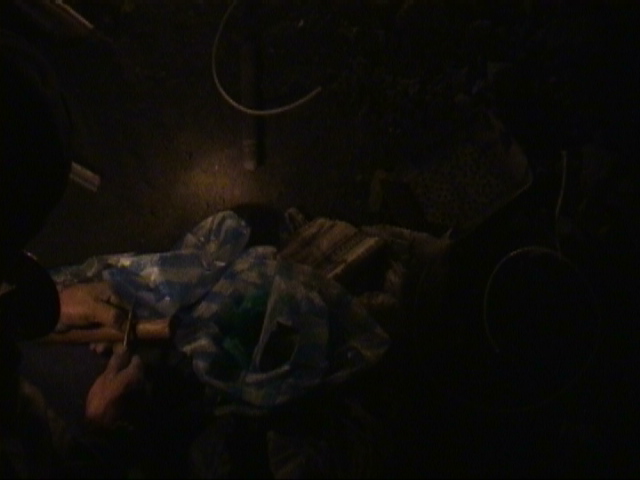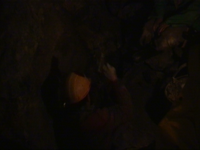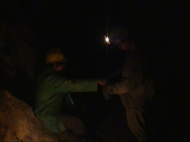 Wenn der Minero mit Hammer und Meissel nicht mehr weiterkommt bzw. neue metallfuehrende Adern gefunden werden muessen, wird Dynamit eingesetzt. Auf dem Foto wird gerade wieder eine Ladung zurechtgemacht. Wir sind dann 20 Meter zurueckgekrochen und haben gewartet, bis es gerummst hat. Der Minero hat anschliessend mit seiner Funzel die Waende abgeleuchtet, ob sich Risse gebildet haben.