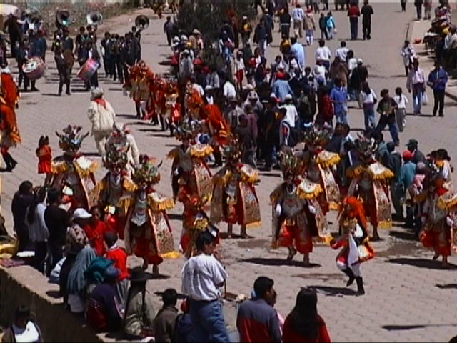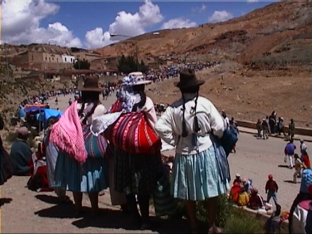Nach altem Indianerglauben wird das Innere des Berges vom Boesen, dem "Tio", auch "Tio Jorge", beherrscht. Mit ihm muss man sich gut stellen. Nur er kann einen beschuetzen. Er hat eine Teufelsgestalt und helle Augen. Wie viele der einstigen Eroberer und Unterdruecker. Alle , die im Berg arbeiten opfern ihm. Kokablaetter und Zigaretten. JedenTag. Nach Angaben, die ich erhielt, liegt das monatliche Einkommen der Cooperativa-Mineros bei ca. 200.- DM. Selbst bei dem niedrigen Preisniveau ist das ein Hungerlohn, von dem keine Familie leben kann. Viele Mineros haetten ihr Glueck in Chile und Argentinien versucht. Dort seien sie aber so miserabel behandelt worden, dass sie zurueckgekommen seien. Sie wuerden lieber als Mineros in diesem Berg schuften, aber dafuer ihr eigener Herr sein. Zwei Tage spaeter war "Carneval de mineros".Ich bin gluecklich darueber, dass ich auch das miterlebt habe. Sonst waere der Eindruck einseitig geblieben. Zu ihrem Karneval ziehen die Mineros in Musik- und praechtig kostuemierten Tanzgruppen unter Dynamitgeknalle vom Cerro Rico herunter in die Stadt, wo sie von der Bevoelkerung erwartet werden.