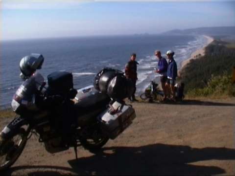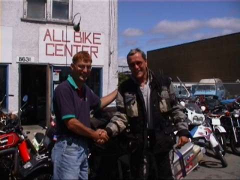 Gaby und ich sind im Norden Amerikas angekommen. Auf der Fahrt von San Francisco, dem letzten Berichtsort, über Portland und Seattle nach Vancouver kamen uns Wiesen, Wälder und Berge oft so vertraut vor, dass es uns kaum gewundert hätte, wenn die Leute im nächsten Dorf Deutsch gesprochen hätten. Das ist hier nun ganz anders. Dunkle Tannenwälder mit hellen Birkenstämmen durchsetzt. In den aufragenden Bergen Gletscher, die weit hinunter reichen. Das Land der Elche und Bären, wie es uns unsere Gastgeber erzählen, wie wir es selbst an unverkennbaren Spuren im Wald feststellen und auf Warntafeln lesen können. Aber bevor ich von unseren Abenteuern im Einzelnen, von wunderschönen Erlebnissen, aber auch Pleiten, Pech und Pannen berichte, zunächst wieder eine Zusammenfassung auf Englisch. Mit dem vom Webmaster installierten Übersetzungsprogramm könnte ich mir das zwar sparen. Aber erstens müssen meine jämmerlichen Englischkenntnisse trainiert werden. Und zweitens möchte ich mich bei unseren neu gewonnenen Freunden mit einem eigenen Text in ihrer Sprache bedanken. Summary after 22000 miles and 9 months out of nowhere in British columbia. The next village, Clinton, on HW 97 is 20 miles away. The neighbours are mainly deers, bears and mooses. The majority is held by moskitos. You meet them everywhere, especially on your skin. One evening when I came back from a run through the forest, our friends explained to me that this would be unwise. The bears would misunderstand it. They would think, that I am anxious and come after me. Since than I am hiking through the forest as a big liar. I am walking very slowly pretending that I am not scared at all. Three weeks ago we started from San Francisco. We went north on route N.1 along the coast. But the Pcific Ocean and the wether on the seaside were too cold to make all the way up to Seattle. Since the snowfall in the Altiplano in Peru 10 000 miles and four months ago it was the first time that it became uncomfortably cold again. We went East and found in the valleys along the rivers not only a wonderful landscae and roads in perfect conditions for motorbiking, but also the wether you expect during the summertime. We had to stop in Eugene because the tank lost gasoline on a nonofficial way. There was a haule to repair. If you ever come this way on a motorbike, you have to stop at Top Gear Motorcycles, 1121 Bailey Hill Rd. (see picture below). They are really excelent on motorbikes. If you are not on a bike it is also worth to stop because they are wonderful people. We spend an evening together, made friends and hope to meet us again. When I was young I often wondered how long I would do motorbiking. Now becoming older I know I will continue until I have to go to heaven. It's the same thing with windsurfing and snowboarding. On a 250 miles trip from Portland, our next stay, I learned that around this town you can found three paradises. For motorbikes the winding roads, for windsurfers River Gorge and for snowboarders Mount Hood. I know this places don't offer intelectuel thrills. But as the romains said a long time ago:"Mens sana in corpore sano."It's the right mixture, what counts. I will not stop trying to walk on both sides of the road. Today when Portland comes to my mind I have Vikki and Rory before my eyes, friends on dream-bikes, Triumph Daytona and Ducati 900 Sport, we met on a gas-station a few days before. They invited us to stay with them during our stop-over in Portland. To live in a house, to sleep in a bed and to sit at a table during two days after 9 months travelling was wonderful. But far the best was sitting together as friends and learning from each other the similar views of live. Seattle has a very good reputation all over the world as a well developed and intersting town. When we stayed there the town gave us an even better impression, because it didn't rain at all.We had only sunshine. So we left Seattle believing it must be a harbour-town on the Mediterranean Sea. Often people thinks their town is the most beautiful of the world. That's quite normal.The Vancouver people does it also, but they may be right. Additionally they have the best embassador you can imagine: Robert (see below, in front of the All Bike Centre). I needed his help, because three spokes on the rear wheel were brokes. We spent a night together. We first had an unbelievable good dinner together and than he showed us his town. At 3 o'clock in the morning we were back in our hostel on Jericho Beach (excelent and economic) very fond of this wonderful town. Now we are heading north. We hope we will arrive in Anchorage in three weeks time and write there our next summary. Nachdem ich meinen letzten Bericht abgeschlossen hatte, blieb mir noch ein Besichtigungstag für San Francisco. Wer diese Stadt nicht selbst besucht hat, wird sie zumindest aus Filmen oder dem Fernsehen kennen. Ich denke an die Szenen, wenn alle ins Auto springen und sich gegenseitig verfolgen, die Guten die Bösen und umgekehrt. Immer dann, wenn die Autos eine steile Strasse hinaufjagen, oben durch die Luft fliegen und auf der anderen Seite bergab wieder landen, handelt es sich um San Francisco. Für die Begriffsstutzigen lässt der Regisseur dann noch eine Cable- Car durchs Bild rollen oder die Golden Gate Bridge im Hintergrund erscheinen. San Francisco sieht wirklich so aus. Zwar gab es an dem Tag, an dem ich die Stadt besichtigte, keine Verfolgungsjagden. Aber sonst war tatsächlich alles so, wie wir es bereits kennen.